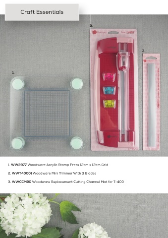 Craft Essentials 2. 2. 3. 1. Craft Essentials 1. WW2977 Woodware Acrylic Stamp Press 12cm x 12cm Grid 2. WWT40001 Woodware Mini Trimmer With 3 Blades 3. WWCCM20 Woodware Replacement Cutting Channel Mat for T-400 178 1 78