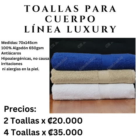 T O A L L A S P A R A C U E R P O L Í N E A L U X U R Y Medidas: 70x145cm 100% Algodón 650gsm Antiácaros Hipoalergénicas, no causa irritaciones ni alergias en la piel. Precios: 2 Toallas x ₡20.000 4 Toallas x ₡35.000