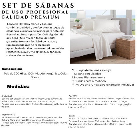 Sábana con Elástico: 146cm Ancho x 196cm Largo x 30cm Alto Sábana con Elástico : 206cm Ancho x 206cm Largo x 30cm Alto