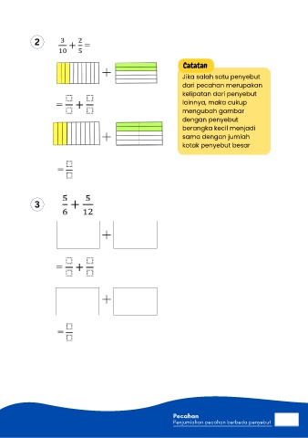 2 Catatan Jika salah satu penyebut dari pecahan merupakan kelipatan dari penyebut lainnya, maka cukup mengubah gambar dengan penyebut berangka kecil menjadi sama dengan jumlah kotak penyebut besar 3 Pecahan Penjumlahan pecahan berbeda penyebut