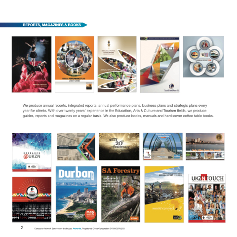 We produce annual reports, integrated reports, annual performance plans, business plans and strategic plans every year for clients. With over twenty years’ experience in the Education, Arts & Culture and Tourism fields, we produce guides, reports and magazines on a regular basis. We also produce books, manuals and hard-cover coffee table books.