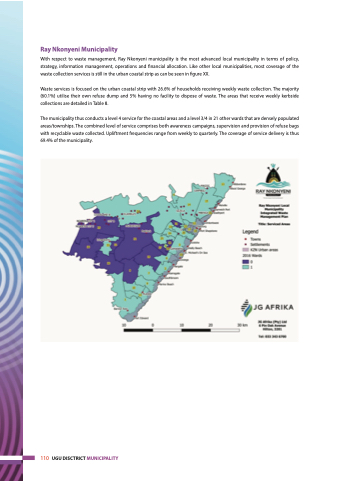 With respect to waste management, Ray Nkonyeni municipality is the most advanced local municipality in terms of policy, strategy, information management, operations and financial allocation. Like other local municipalities, most coverage of the waste collection services is still in the urban coastal strip as can be seen in figure XX.
