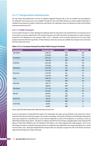 Access to public transport is a major development challenge within the Ugu District and a potential factor in increasing access of communities to economic opportunities. 87% of public transport users within the district are dependent on minibus transport, compared to 9% dependent on bus transport. Table 3.10.4.1.1 illustrates current commuter demand from the main public transport terminals within the Ugu District. In those instances, where bus services are available, they transport more commuters than the minibus taxi service.