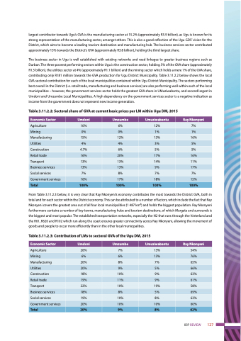 largest contributor towards Ugu’s GVA is the manufacturing sector at 15.2% (approximately R3.9 billion), as Ugu is known for its strong representation of the manufacturing sector, amongst others. This is also a good reflection of the Ugu GDS’ vision for the District, which aims to become a leading tourism destination and manufacturing hub. The business services sector contributed approximately 15% towards the District’s GVA (approximately R3.8 billion), holding the third largest share.