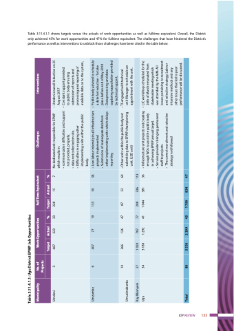 Table 3.11.4.1.1 shows targets versus the actuals of work opportunities as well as fulltime equivalent. Overall, the District only achieved 45% for work opportunities and 47% for fulltime equivalent. The challenges that have hindered the District’s performance as well as interventions to unblock those challenges have been cited in the table below.