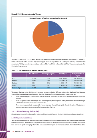 Table 3.11.7.3 and Figure 3.11.7.1 shows that the ‘VFR’ market for international trips contributed between R157.9 and R315.8 million (which is 52% of the economic impact of all trips) to local economy of the South Coast region. Following on from the ‘VFR’ market is the ‘Holiday’ market which contributes between R81.9 and R163.9 million (which is 27% of the economic impact of all trips) to the local economy.