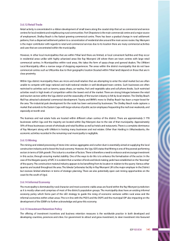 The municipality is dominated by rural character and most economic viable areas are found within the Ray Nkonyeni jurisdiction as it is mostly urban and comprises of most of the district’s population groups. The municipality does have an existing informal economy policy which forms part of the LED strategy to guide the rising of economic ventures within rural areas and the informal economies within urban areas. This is in line with the PGDS and the DGPS and the municipal IDP also impacting on the development of the SDBIPs to further acknowledge and grow this economy.
