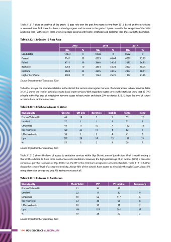 Table 3.12.1.1 gives an analysis of the grade 12 pass rate over the past five years starting from 2012. Based on these statistics as received from DoE there has been a steady progress and increase in the grade 12 pass rate with the exception of the 2014 academic year. Furthermore, there are more people passing with higher certificate and diplomas than those with the bachelors.