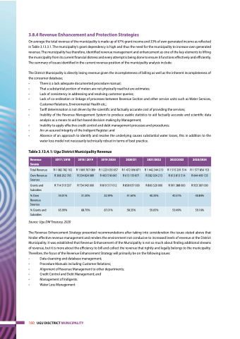 On average the total revenue of the municipality is made up of 67% grant income and 33% of own generated income as reflected in Table 3.13.3.1. The municipality’s grant dependency is high and thus the need for the municipality to increase own generated revenue. The municipality has therefore, identified revenue management and enhancement as one of the key elements to lifting the municipality from its current financial distress and every attempt is being done to ensure it functions effectively and efficiently. The summary of issues identified in the current revenue position of the municipality analysis include: