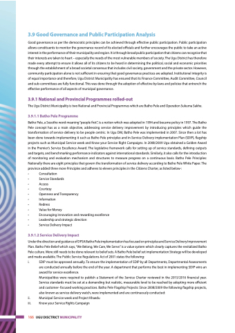 Batho Pele, a Sesotho word meaning “people first”, is a notion which was adopted in 1994 and became policy in 1997. The Batho Pele concept has as a main objective, addressing service delivery improvement by introducing principles which guide the transformation of service delivery to be people centric. In Ugu DM, Batho Pele was implemented in 2007. Since then a lot has been done towards implementing it such as Batho Pele principles and in-Service Delivery implementation Plan (SDIP), flagship projects such as Municipal Service week and Know your Service Right Campaigns. In 2008/2009 Ugu obtained a Golden Award in the Premier’s Service Excellence Award. The legislative framework calls for setting up of service standards, defining outputs and targets, and benchmarking performance indicators against international standards. Similarly, it also calls for the introduction of monitoring and evaluation mechanism and structures to measure progress on a continuous basis. Batho Pele Principles: Nationally there are eight principles that govern the transformation of service delivery according to Batho Pele White Paper. The province added three more Principles and adheres to eleven principles in the Citizens Charter, as listed below-: