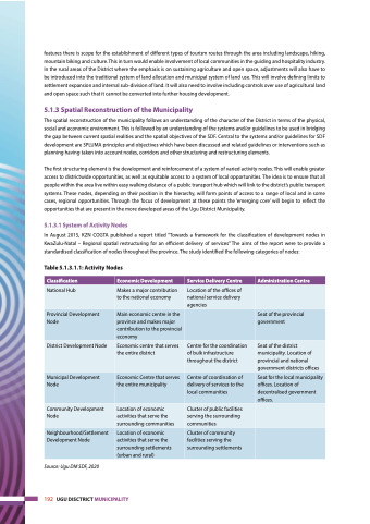 The first structuring element is the development and reinforcement of a system of varied activity nodes. This will enable greater access to districtwide opportunities, as well as equitable access to a system of local opportunities. The idea is to ensure that all people within the area live within easy walking distance of a public transport hub which will link to the district’s public transport systems. These nodes, depending on their position in the hierarchy, will form points of access to a range of local and in some cases, regional opportunities. Through the focus of development at these points the ‘emerging core’ will begin to reflect the opportunities that are present in the more developed areas of the Ugu District Municipality.