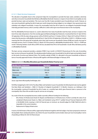 N.B. When budgeting for 2021/22 for Free Basic Water and Sanitation to poor households, the following formula must be applied: Free Basic Water and Sanitation = R383.12 X Number of indigents households’ X 12 Months. However, our challenge is that the municipality is giving all households free 6kl of water on a monthly basis which gives financial strain or pressure to the municipality. Also, those who are able to pay for services are not paying.