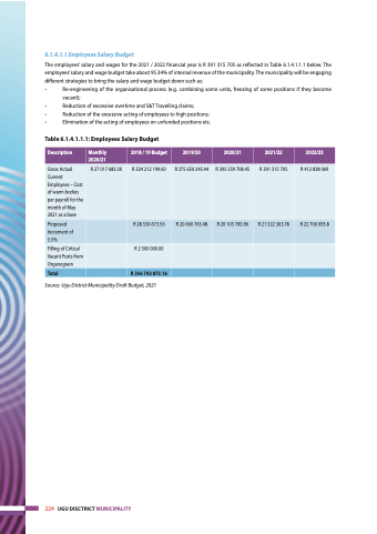 The employees’ salary and wages for the 2021 / 2022 financial year is R 391 315 705 as reflected in Table 6.1.4.1.1.1 below. The employees’ salary and wage budget take about 95.34% of internal revenue of the municipality. The municipality will be engaging different strategies to bring the salary and wage budget down such as: