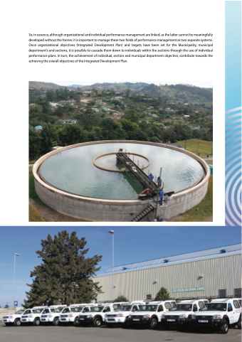 So, in essence, although organizational and individual performance management are linked, as the latter cannot be meaningfully developed without the former, it is important to manage these two fields of performance management as two separate systems. Once organizational objectives (Integrated Development Plan) and targets have been set for the Municipality, municipal department’s and sections, it is possible to cascade them down to individuals within the sections through the use of individual performance plans. In turn, the achievement of individual, section and municipal department objective, contribute towards the achieving the overall objectives of the Integrated Development Plan.