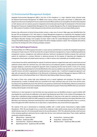 Furthermore, it is also important to note that these two major perennial rivers are identified as being in a good condition (A/B class) despite the current levels of modification in the district (Ugu Biodversity Sector Plan). In the context of Umuziwabantu, the Vungu River is identified as being moderately affected by modification (C-class) due to the nature of a coastal area, there are a large number of catchments within the UDM, ranging from small, localised catchments spanning a few square kilometres to the Mzimkhulu and Umkomaas Catchments stretching back to their headwaters in the Drakensberg Mountains. There is a common theme throughout the UDM in that there are no major dams or impoundments, only several small local supply dams.
