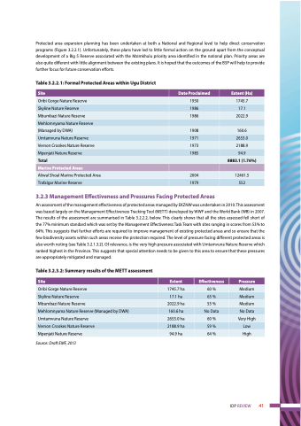 An assessment of the management effectiveness of protected areas managed by EKZNW was undertaken in 2010. This assessment was based largely on the Management Effectiveness Tracking Tool (METT) developed by WWF and the World Bank (WB) in 2007. The results of the assessment are summarised in Table 3.2.2.2, below. This clearly shows that all the sites assessed fell short of the 77% minimum standard which was set by the Management Effectiveness Task Team with sites ranging in scores from 53% to 64%. This suggests that further efforts are required to improve management of existing protected areas and so ensure that the few biodiversity assets within such areas receive the protection required. The level of pressure facing different protected areas is also worth noting (see Table 3.2.1.3.2). Of relevance, is the very high pressure associated with Umtamvuna Nature Reserve which ranked highest in the Province. This suggests that special attention needs to be given to this area to ensure that these pressures are appropriately mitigated and managed.