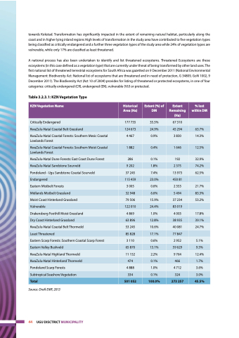 towards Kokstad. Transformation has significantly impacted in the extent of remaining natural habitat, particularly along the coast and in higher lying inland regions High levels of transformation in the study area have contributed to five vegetation types being classified as critically endangered and a further three vegetation types of the study area while 24% of vegetation types are vulnerable, while only 17% are classified as least threatened.