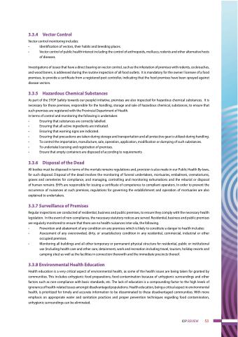 Investigations of issues that have a direct bearing on vector control, such as the infestation of premises with rodents, cockroaches, and wood borers, is addressed during the routine inspection of all food outlets. It is mandatory for the owner/ licensee of a food premises, to provide a certificate from a registered pest controller, indicating that the food premises have been sprayed against disease vectors.