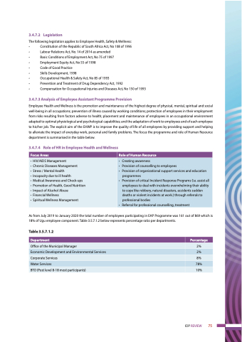 As from July 2019 to January 2020 the total number of employees participating in EAP Programme was 161 out of 869 which is 18% of Ugu employee component. Table 3.5.7.1.2 below represents percentage ratio per departments.