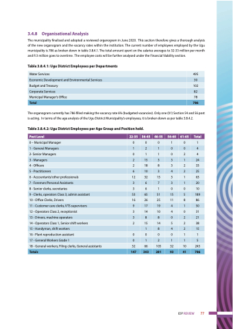 The municipality finalised and adopted a reviewed organogram in June 2020. This section therefore gives a thorough analysis of the new organogram and the vacancy rates within the institution. The current number of employees employed by the Ugu municipality is 786 as broken down in table 3.8.4.1. The total amount spent on the salaries averages to 32-33 million per month and R 3 million goes to overtime. The employee costs will be further analysed under the Financial Viability section.