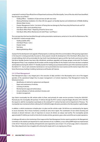 A project for the development and upgrade of fixed property is underway where the accommodation of the growing organisation in the long term is being proactively focussed on, these projects include the development of the Oslo Beach offices phase 3 to include buildings which will accommodate the Ugu South Coast development agency and the Ugu South coast tourism entities. Park Rynie Standby Quarters have been fully refurbished, workshops upgraded, and storage garages constructed. The Disaster Management Phase 2 was completed, the fire tenders and the storage facilities for the Disaster centre have also been completed and handed over during the 2020/21 FY. Standby Quarters for Harding was purchased and forms part of the maintenance plan for the 2020/21 FY. Due to cash constraints maintenance is not as preventative but more reactive and the Section hopes that in the future financial year, backlog in building maintenance and facades will improve.