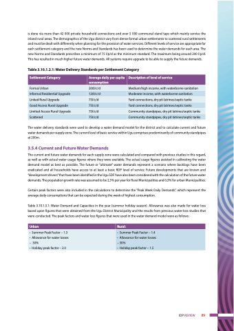 is done via more than 42 000 private household connections and over 5 000 communal stand taps which mainly service the inland rural areas. The demographics of the Ugu district vary from dense formal urban settlements to scattered rural settlements and must be dealt with differently when planning for the provision of water services. Different levels of service are appropriate for each settlement category and the new Norms and Standards has been used to determine the water demands for each area. The new Norms and Standards prescribes a minimum of 75 l/p/d as the minimum standard. The maximum being around 200 l/p/d. This has resulted in much higher future water demands. All systems require upgrade to be able to supply the future demands.
