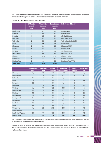 The above table clearly shows where current infrastructure capacity problems are experienced, and where the infrastructure will be inadequate to meet the future water requirements.