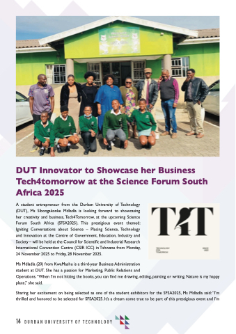 A student entrepreneur from the Durban University of Technology (DUT), Ms Sibongakonke Mdladla is looking forward to showcasing her creativity and business, Tech4Tomorrow, at the upcoming Science Forum South Africa (SFSA2025). This prestigious event themed: Igniting Conversations about Science – Placing Science, Technology and Innovation at the Centre of Government, Education, Industry and Society – will be held at the Council for Scientific and Industrial Research International Convention Centre (CSIR ICC) in Tshwane from Monday, 24 November 2025 to Friday, 28 November 2025.
