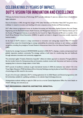THIS year, the Durban University of Technology (DUT) proudly celebrates 21 years as a dynamic force in South African higher education.