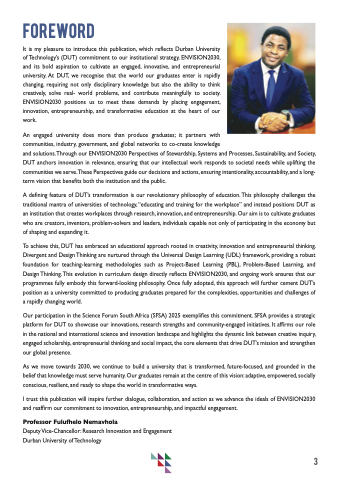 It is my pleasure to introduce this publication, which reflects Durban University of Technology’s (DUT) commitment to our institutional strategy, ENVISION2030, and its bold aspiration to cultivate an engaged, innovative, and entrepreneurial university. At DUT, we recognise that the world our graduates enter is rapidly changing, requiring not only disciplinary knowledge but also the ability to think creatively, solve real- world problems, and contribute meaningfully to society. ENVISION2030 positions us to meet these demands by placing engagement, innovation, entrepreneurship, and transformative education at the heart of our work.