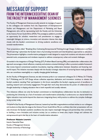 On behalf of the Faculty of Management Sciences, I extend my heartfelt congratulations and best wishes to our colleagues and students as they take the stage at the Science Forum South Africa.We are confident that their presentation will not only showcase the faculty’s academic excellence but also inspire meaningful dialogue and partnerships that contribute to building a more innovative and inclusive society. Let us continue to break silos, inspire change and cultivate the entrepreneurial spirit that lies at the heart of transformative education.