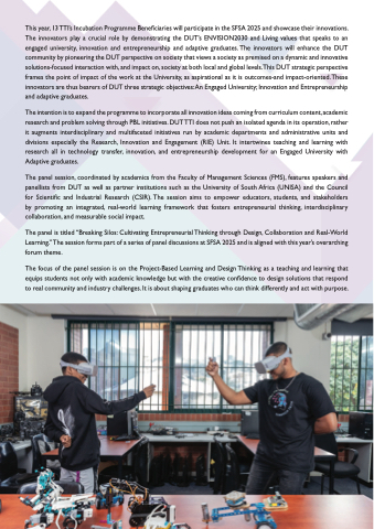 This year, 13 TTI’s Incubation Programme Beneficiaries will participate in the SFSA 2025 and showcase their innovations. The innovators play a crucial role by demonstrating the DUT’s ENVISION2030 and Living values that speaks to an engaged university, innovation and entrepreneurship and adaptive graduates. The innovators will enhance the DUT community by pioneering the DUT perspective on society that views a society as premised on a dynamic and innovative solutions-focused interaction with, and impact on, society at both local and global levels.This DUT strategic perspective frames the point of impact of the work at the University, as aspirational as it is outcomes-and impact-oriented.These innovators are thus bearers of DUT three strategic objectives:An Engaged University; Innovation and Entrepreneurship and adaptive graduates.