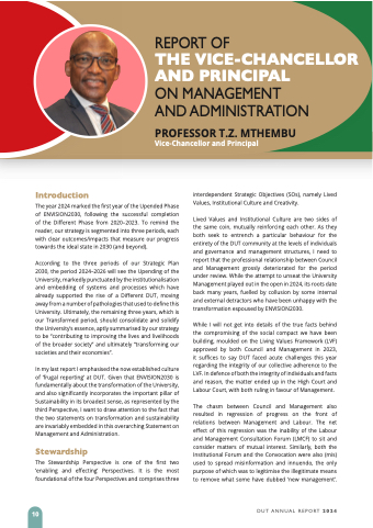 In my last report I emphasised the now established culture of ‘frugal reporting’ at DUT. Given that ENVISION2030 is fundamentally about the transformation of the University, and also significantly incorporates the important pillar of Sustainability in its broadest sense, as represented by the third Perspective, I want to draw attention to the fact that the two statements on transformation and sustainability are invariably embedded in this overarching Statement on Management and Administration.