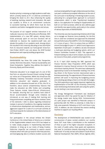‘Distinctive education’ is an integral part of a set of SOs that form an education-focused thread running through our entire set of Perspectives. Within this thread are the following: ‘creativity’, ‘innovative curricula and research’, ‘distinctive education’ and ‘adaptive graduates’. In addition to the education-focused set of SOs, this SO is, therefore, about several complementary features that make the education we offer holistic and compelling. These features include ‘state-of-the-art infrastructure’, for example, ensuring that our students have state-of- the-art accommodation through some initiatives we introduced, as one way of making their learning and living environment compelling and future oriented. Some of the elements I refer to above regarding institutional reviews in pursuit of excellence, the ongoing investment in infrastructure development and maintenance, and our aggressive support for a suite of co-curricular activities all contribute towards the realisation of the distinctiveness of DUT’s education.