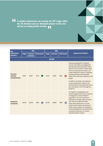 has been intensified, and engagement with the KZN Central Admissions Office (CAO) for DUT processes to make timely offers and improvements made to the student registration system is underway, including meeting the overall CESM targets, with a particular emphasis on SET targets.