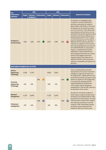 high academic staff attrition in 2023 and the slow pace of recruitment processes across the university. These delays were exacerbated by external factors such as extended notice periods required at other institutions and internal inefficiencies in finalising appointments. From a quality assurance perspective, DUT has taken a deliberate shift to prioritise supervisor readiness and alignment of PG research with national development priorities and DUT’s ENVISION2030. As a prescriptive solution, a comprehensive academic staffing plan is being implemented in 2025, alongside fast-tracked recruitment protocols and targeted supervision capacity-building. These steps aim to stabilise enrolment trends and ensure long-term sustainability and quality in PG education.