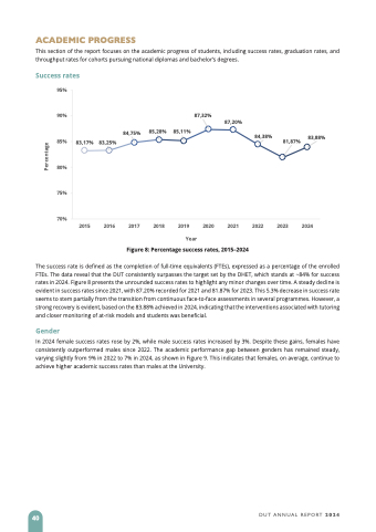 This section of the report focuses on the academic progress of students, including success rates, graduation rates, and throughput rates for cohorts pursuing national diplomas and bachelor’s degrees.