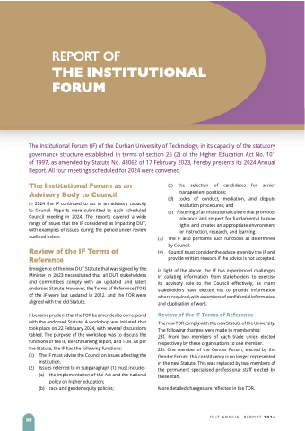 The Institutional Forum (IF) of the Durban University of Technology, in its capacity of the statutory governance structure established in terms of section 26 (2) of the Higher Education Act No. 101 of 1997, as amended by Statute No. 48062 of 17 February 2023, hereby presents its 2024 Annual Report. All four meetings scheduled for 2024 were convened.