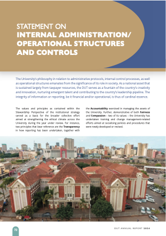 as operational structures emanates from the significance of its role in society. As a national asset that is sustained largely from taxpayer resources, the DUT serves as a fountain of the country’s creativity and innovation, nurturing emergent talent and contributing to the country’s leadership pipeline. The integrity of information or reporting, be it financial and/or operational, is thus of cardinal essence.