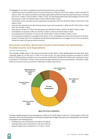 The university is highly reliant on first and second stream income, which is state subsidy grants and tuition fees, which collectively makes up 76.73% (2023: 77.79%) of the total income. The state subsidy and grants accounted for 39.81% (2023: 42.79%) and tuition and other income accounted for 36.92% (2023: 35.00%) of the total income. Investment income accounted for 14.57% (2023: 13.54%); contract income and sales of goods and services accounted for 1.87% (2023: 2.33%); while non-recurrent income accounted for 6.83% (2023: 6.33%) of total income.
