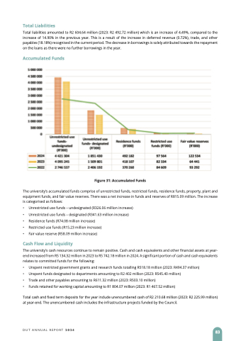 The university’s cash resources continue to remain positive. Cash and cash equivalents and other financial assets at year- end increased from R5 134.32 million in 2023 to R5 742.18 million in 2024. A significant portion of cash and cash equivalents relates to committed funds for the following: