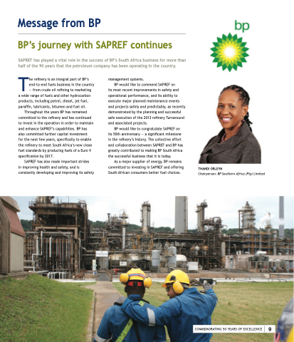 BP would like to congratulate SAPREF on its 50th anniversary — a significant milestone in the refinery’s history. The collective effort and collaboration between SAPREF and BP has greatly contributed to making BP South Africa the successful business that it is today.