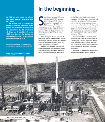 Within three years the site, now part of Prospecton, Durban, was transformed into one of the largest refineries south of the Sahara and one of the most advanced in the world, at a cost of approximately R32million.