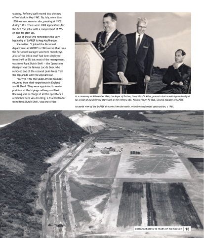 At a ceremony on 6 November 1960, the Mayor of Durban, Councillor CA Milne, pressed a button which gave the signal for a team of bulldozers to start work on the refinery site. Watching is Mr WJ Stok, General Manager of SAPREF.