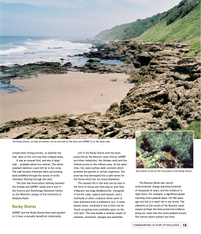 Life in the Rocky Shores area has been protected by the Reunion canal (fed by SAPREF and other industries), the Umlaas canal and the limited access to the refinery area. At the same time, the canal outflow adds nutrients which promote the growth of certain organisms. The area has thus developed into a safe haven for life forms which are not found elsewhere.
