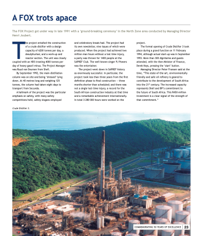 Managing Director Peter Fransen said at the time, “This state-of-the-art, environmentally friendly and safe oil refinery is geared to contribute to the development of South Africa into the 21st century. The increased capacity represents Shell and BP’s commitment to