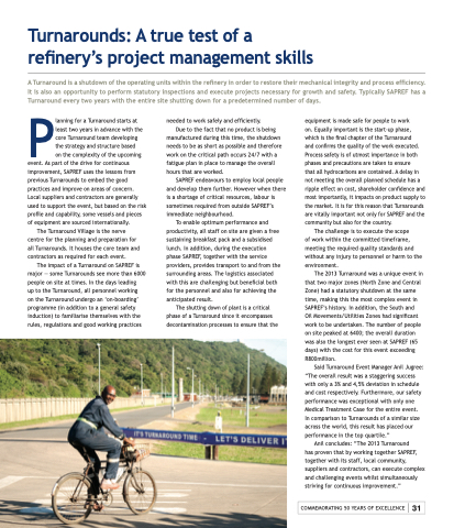 that all hydrocarbons are contained. A delay in not meeting the overall planned schedule has a ripple effect on cost, shareholder confidence and most importantly, it impacts on product supply to the market. It is for this reason that Turnarounds are vitally important not only for SAPREF and the community but also for the country.