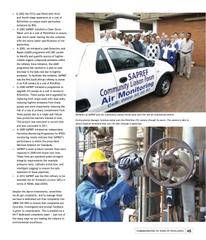 • In 2012 SAPREF was the first refinery to be awarded the Air Emissions Licence (AEL) in terms of NEMA: AQA (2004).