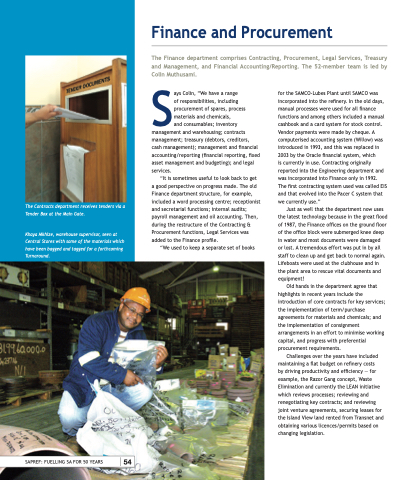 for the SAMCO-Lubes Plant until SAMCO was incorporated into the refinery. In the old days, manual processes were used for all finance functions and among others included a manual cashbook and a card system for stock control. Vendor payments were made by cheque. A computerised accounting system (Willow) was introduced in 1993, and this was replaced in 2003 by the Oracle financial system, which