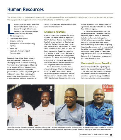 The Human Resources department is essentially a consultancy responsible for the delivery of key human resource processes that facilitate the engagement, management development and leadership of SAPREF’s people.
